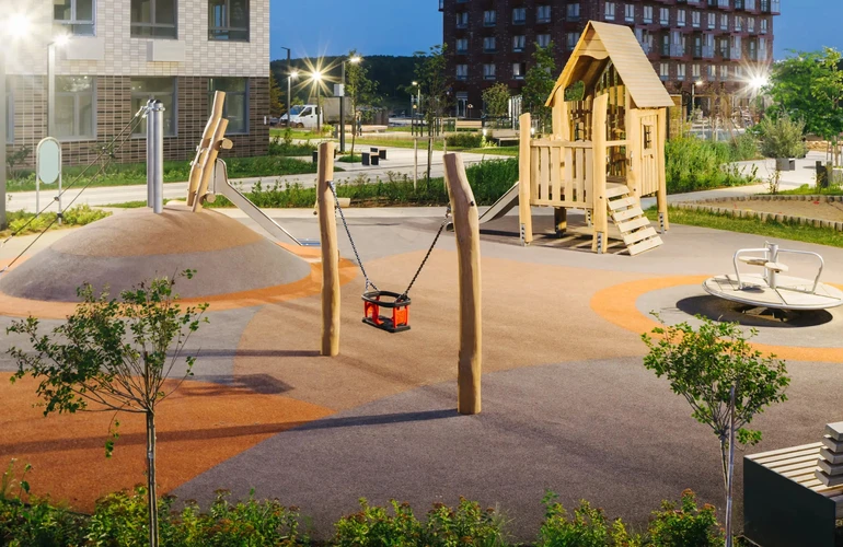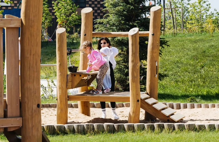 Чтобы дети как можно больше времени проводили на улице, мы придумали особый формат игровых площадок — PlayHub. Каждая из них с уникальным ландшафтом и игровыми плотинами на искусственном ручье. А благодаря абстрактным формам игрового оборудования дети могут придумать бесконечное количество игр.